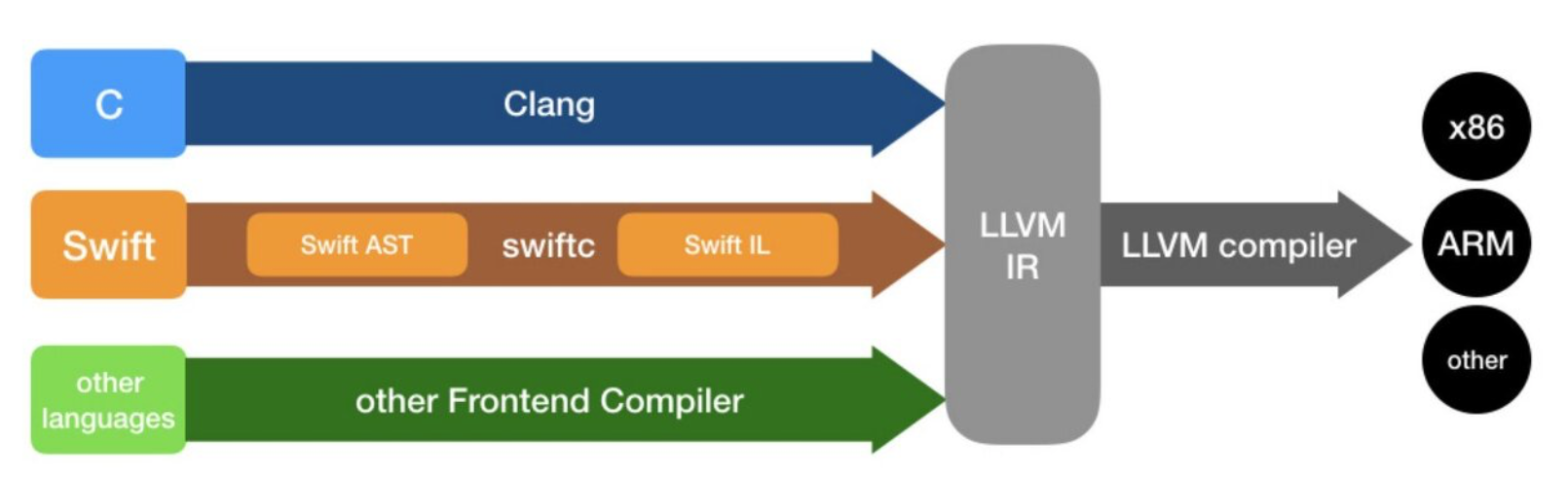 - 프론트엔드: Swift 소스코드 → Swift AST → Swift IL(SIL) → LLVM IR