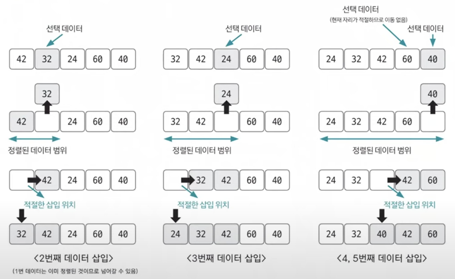 선택 데이터를 현재 정렬된 데이터 범위 내에서 적절한 위치에 삽입하는 방법이다.